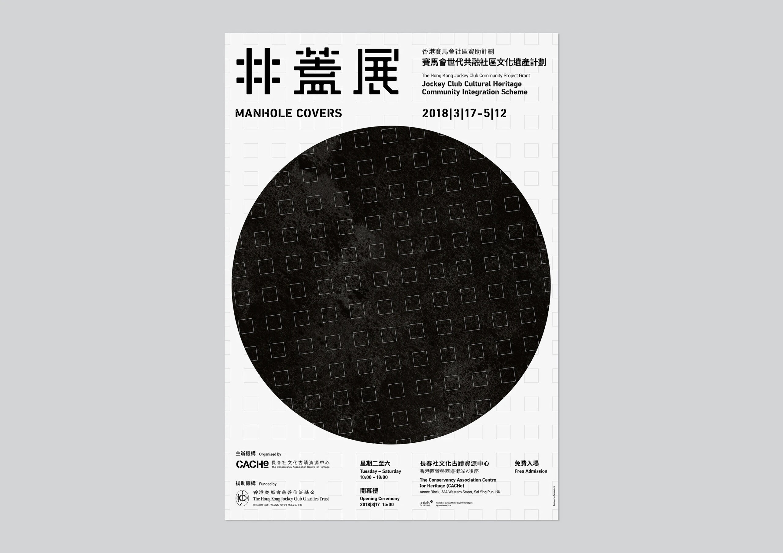 The Conservancy Association Centre for Heritage (CACHe) organises this “Manhole Covers” exhibition in hope of unearthing the secret information hidden in the manhole covers, so as to attain better knowledge of iron foundries of our city, its craftsmen and operatives, to exhibit the birth of a manhole cover, and to explore the history of Hong Kong’s progressive public works. Through these most common covers, we present you the least explored territory of Hong Kong’s history.